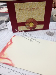 With Cherry Cobbler cardstock as the base, the Daffodil Delight leaved patterned DSP and Shimmer paper it is a fun and easy way to have an elegant impact. Using Daffodil Delight and Cherry Cobbler reinkers and a baby wipe it creates a liquid tie-dyed look.